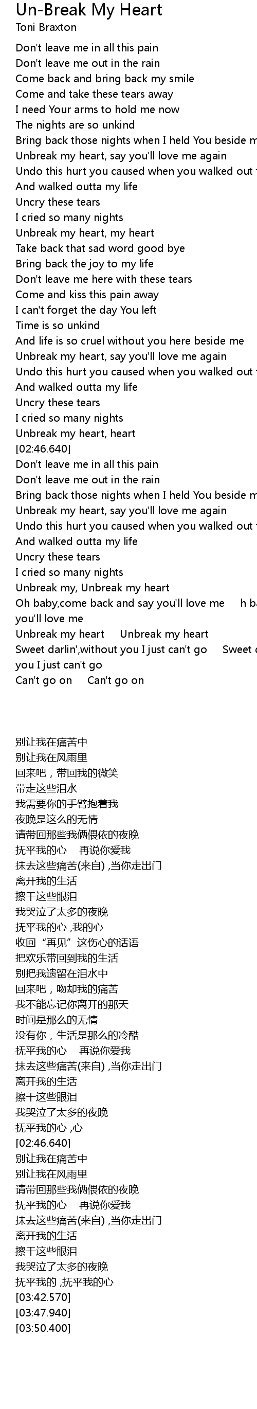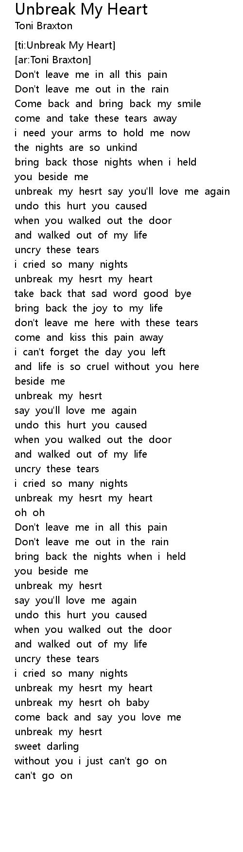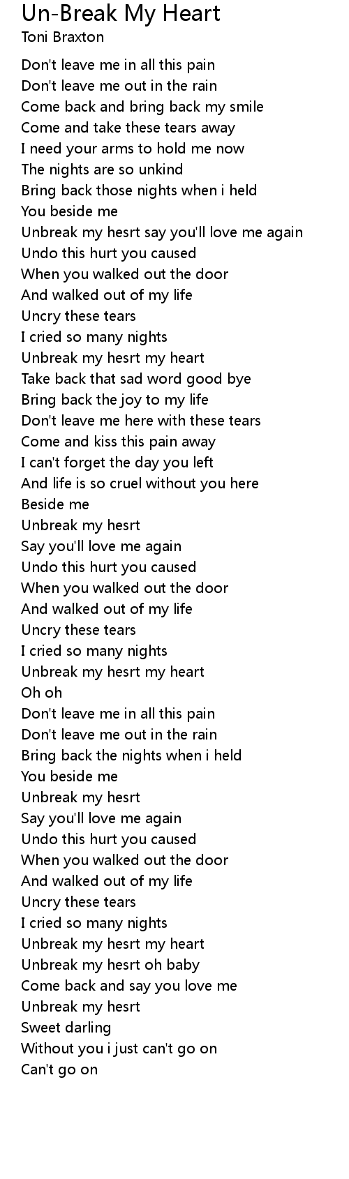 Love Karaoke? Our brand new app is here! Download now for FREE https://singking.link/yt-desc Karaoke sing along of "Un-Break . Unbreak My Heart Lyrics are a topic that is being searched for and favored by netizens nowadays. You can Save the Unbreak My Heart Lyrics here. Download all royalty-free pic. Unbreak my heart lyrics, can ya'll believe i made this when i was like 12 lmaoooo, this is a really shitty lyric video too but i guess you guys were desperate..